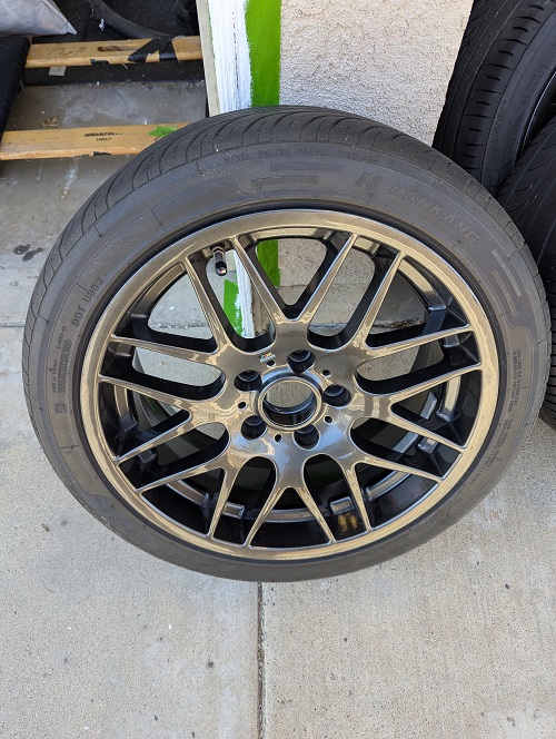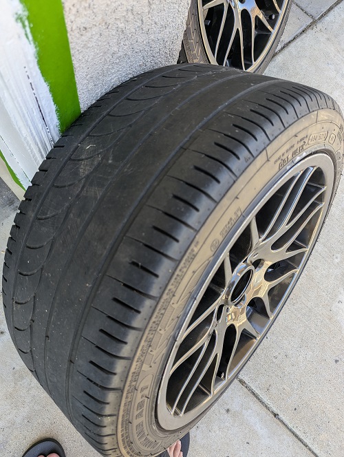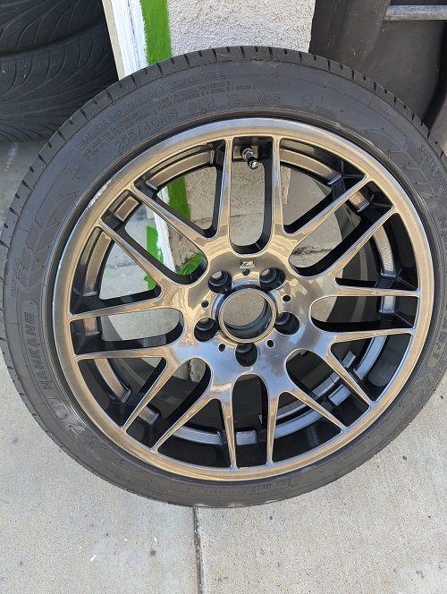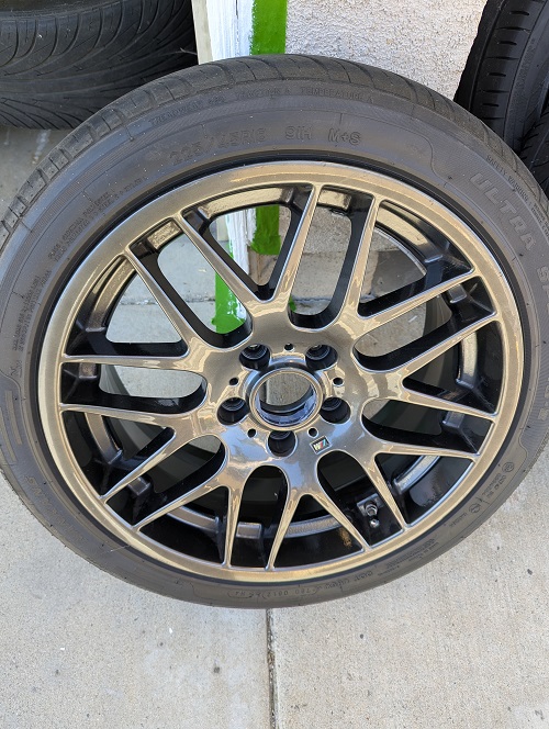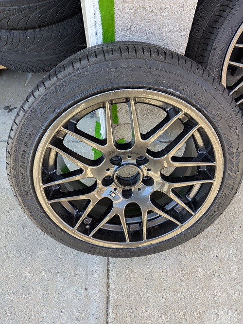 Set of 4 Knockoff CSL wheels and tires on the car when I bought with my 2007 Z4M Coupe. Can make a reliable set as backups or just a change in look. I put the stock set back on the vehicle when I purchased the vehicle, so these are taking up space in the garage and need them out. 18x8 and 18x9 stagger; 225/45/18 and 255/40/18 currently mounted on them, so assuming these were ordered in the stock sizes and offset. I cant quite read the specifics on the back of the wheels but the sizes are correct. I was able to make those out though. Tires are Nankang. Never heard of these before....two are worn....two might be usable for a limited amount of time. Some rash on the wheels, but not extensive. Pickup only in Orange County, CA....Huntington Beach area. $200.00 for the whole set... Thanks in advance for the consideration. |